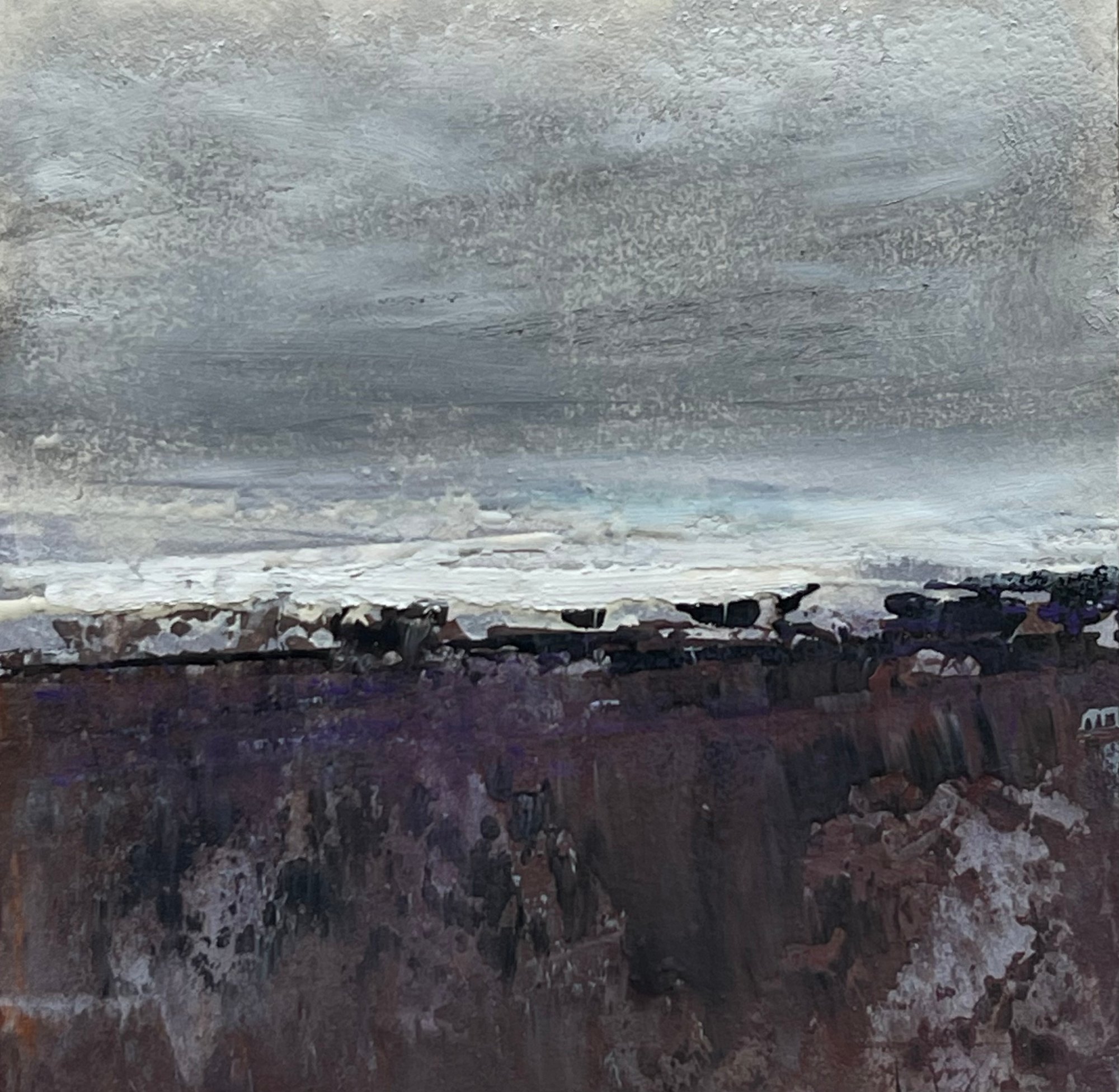 A miniature study exploring the meeting of land and sky. Expressive marks and tonal contrasts evoke Cornwall’s elemental beauty.