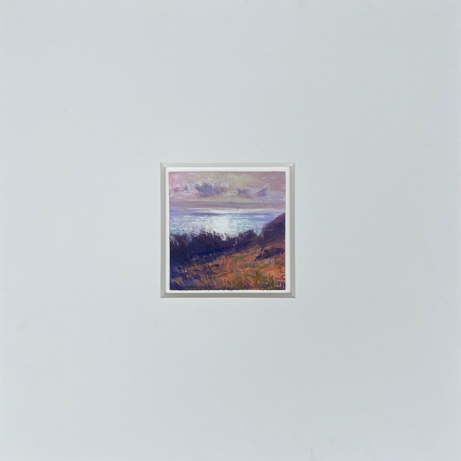 A luminous little seascape capturing that quiet shift as day gives way to evening. The soft pinks and violets of the sky meet the silvery light across the water, framed by warm earth tones in the foreground. A gentle yet expressive piece, painted with rich texture and depth in oils.