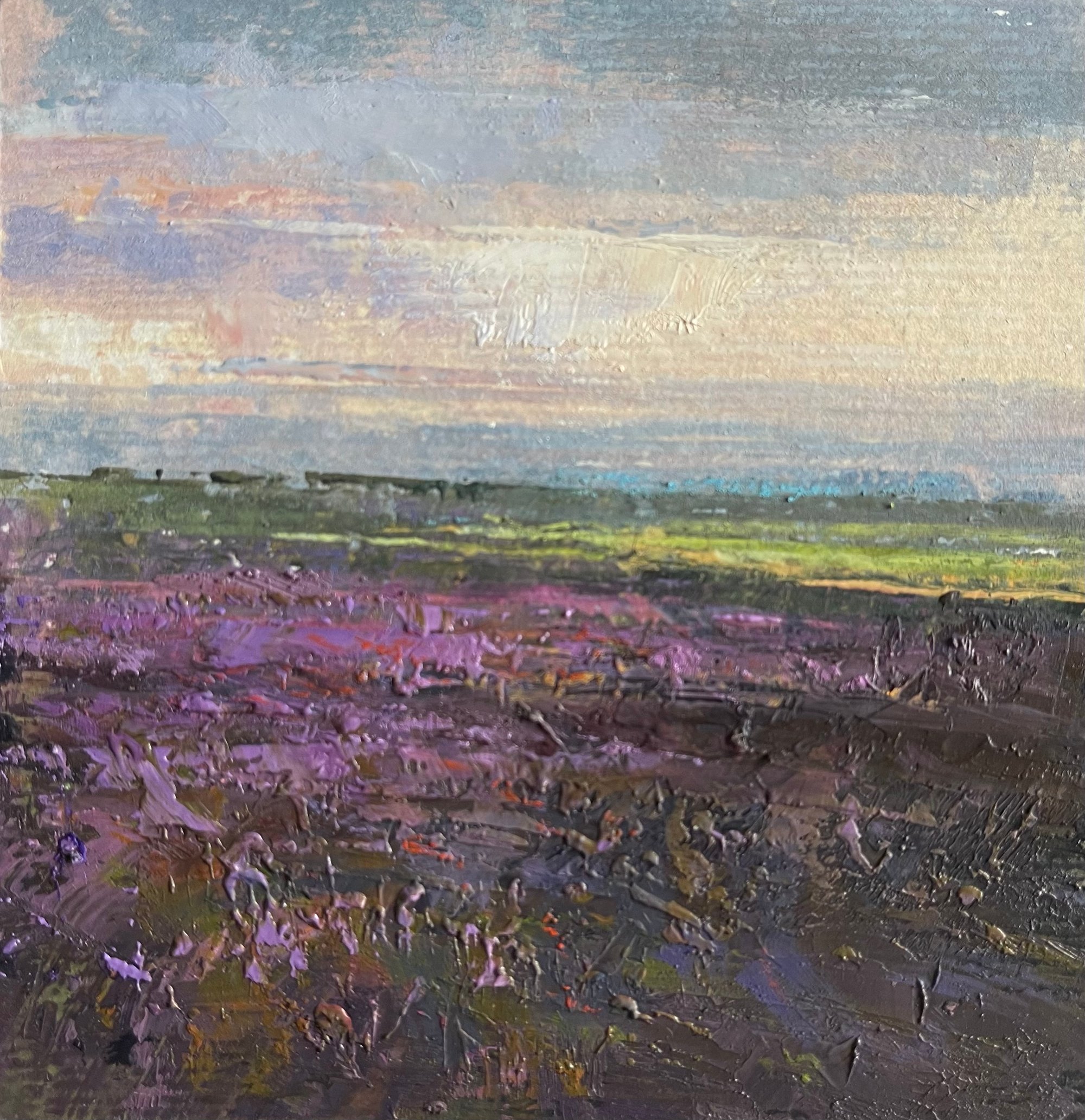 A soft, expressive glimpse of late summer on the moor — when the land is tinged violet and dusk begins to settle. This painting captures the quiet glow of Cornish heather under a cooling sky, inviting you into a fleeting moment of stillness and colour.